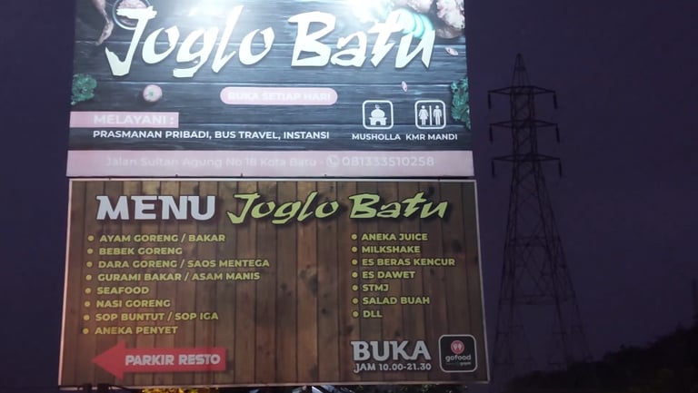 Jika anda mencari tongkrongan di kota Batu atau istirahat sejenak bahkan sekaligus makan, rumah makan Joglo sepertinya tepat bagi anda karena berada di lereng gunung Pandeman berdekatan dengan beberapa tempat wisata. Memiliki panorama khas Pegunungan. Kami bukan beriklan atau berpromosi karena kami tidak mengenal pemilik dan karyawan rumah makan Joglo. Apa yang kami sampaikan sesuai dengan kenyataan aslinya seperti video di atas. Harga tidak terlalu mahal, standart rumah makan. Tempatnya luas. Sangat tepat walaupun anda membawa keluarga ataupun membawa rombongan teman selolah. Kendaraan besar seperti Bus tersedia tempat parkir.